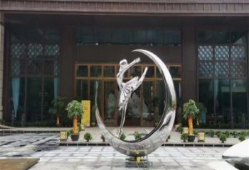 創意不銹鋼月亮上跳舞女孩景觀雕塑